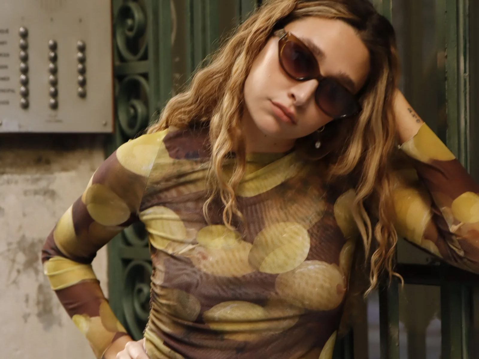 Top elástico ajustado de manga larga, con frunce en el lateral derecho. Sublimado con un estampado único. Prenda completa confeccionada de tul elástico reciclado. Top exterior y forro sublimados del estampado Nisi.