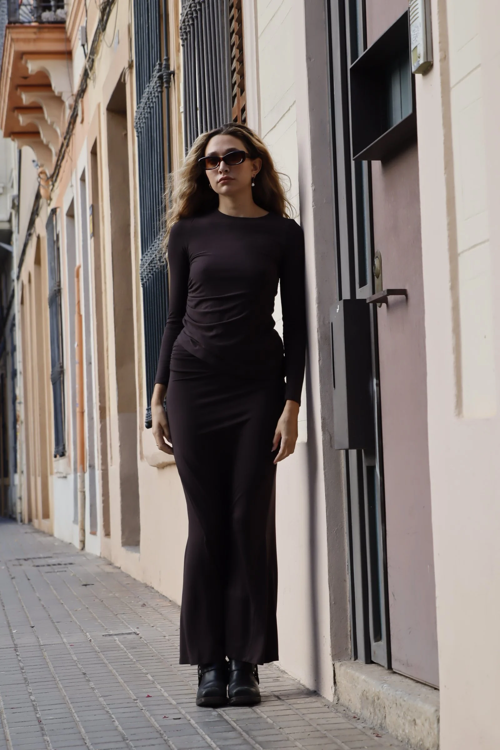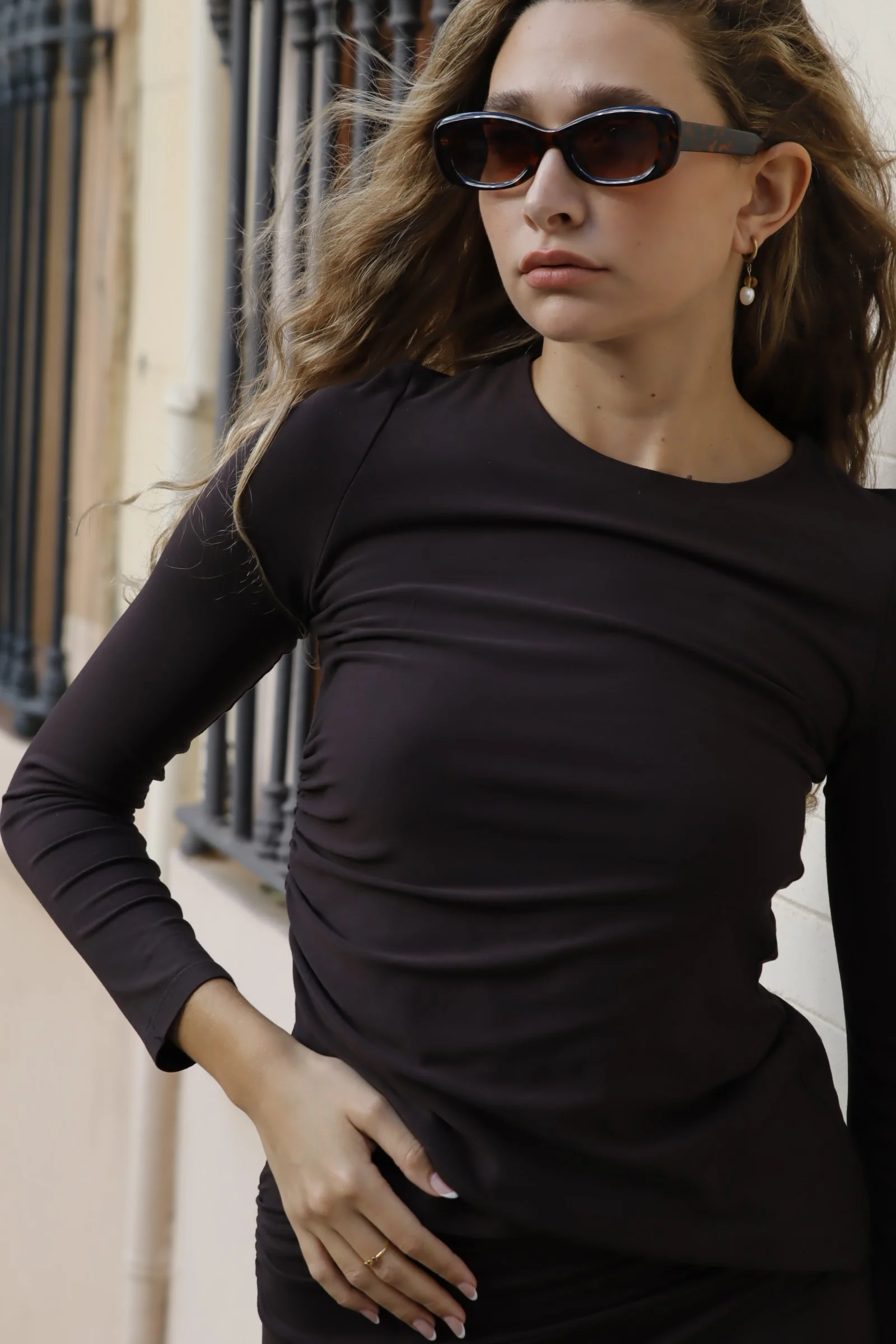 Top elástico ajustado de manga larga, con frunce en el lateral derecho. Forrado y confeccionado con material de primera calidad, viscosa natural.