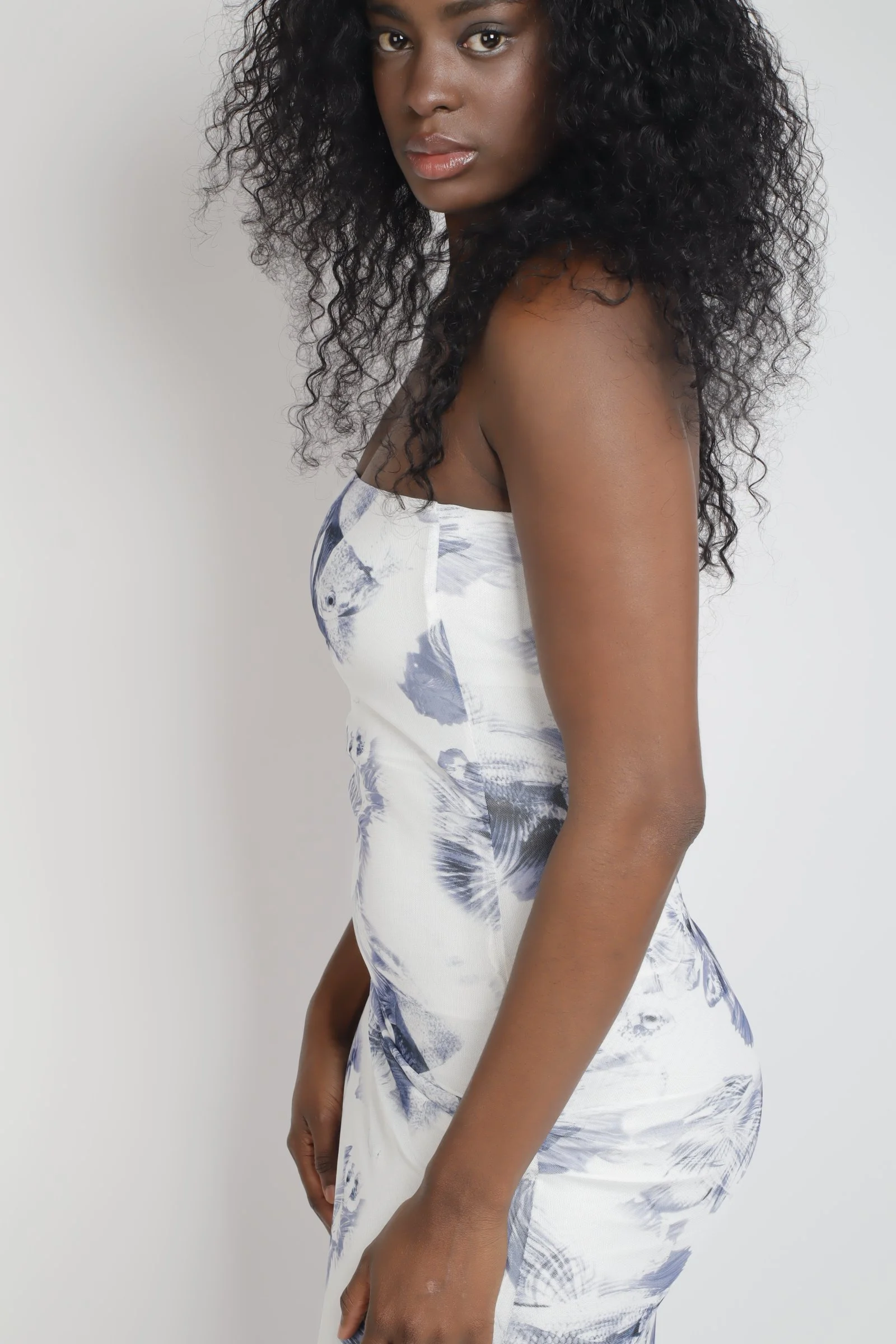 Vestido elástico entallado. Sublimado con un estampado único en el vestido exterior. Vestido principal confeccionado en tul elástico reciclado. Forro interior de viscosa natural. Acabado en el escote con silicona.