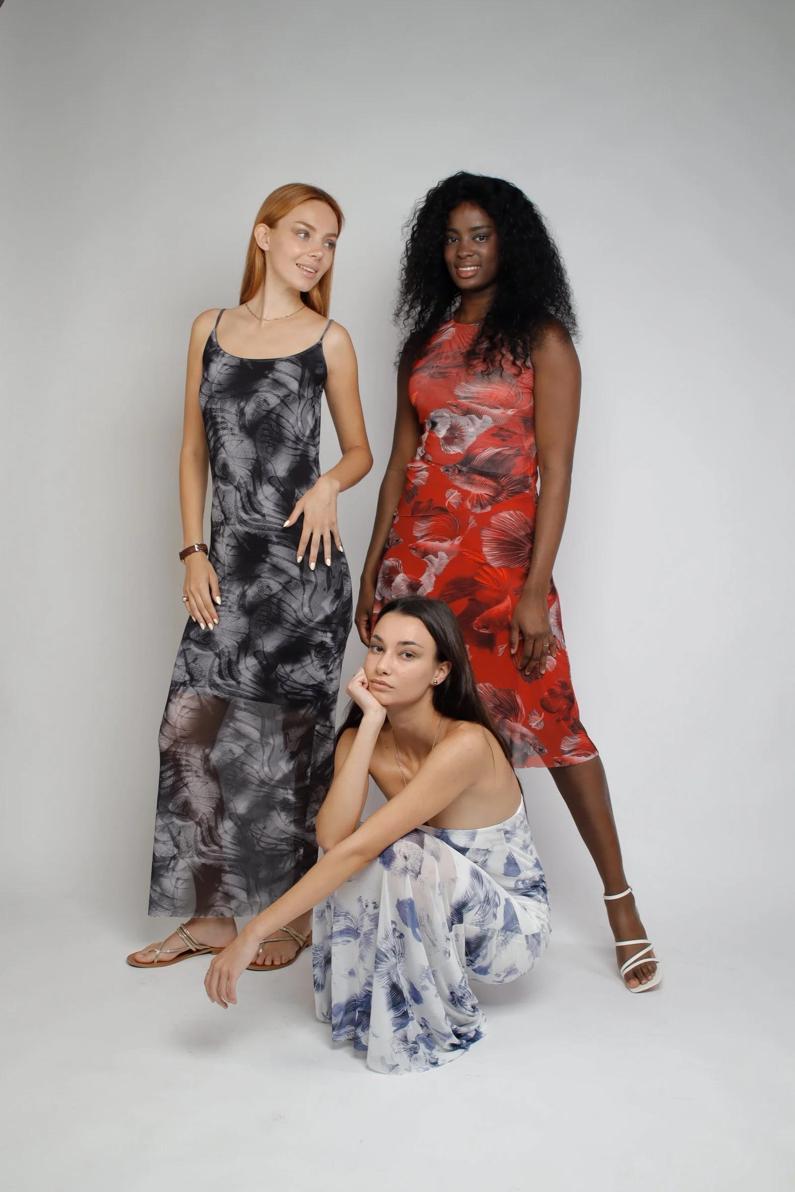 Vestido elástico entallado. Sublimado con un estampado único en el vestido exterior. Vestido principal confeccionado en tul elástico reciclado. Forro interior de viscosa natural. Sujeto al cuerpo por dos tirantes reforzados con silicona.