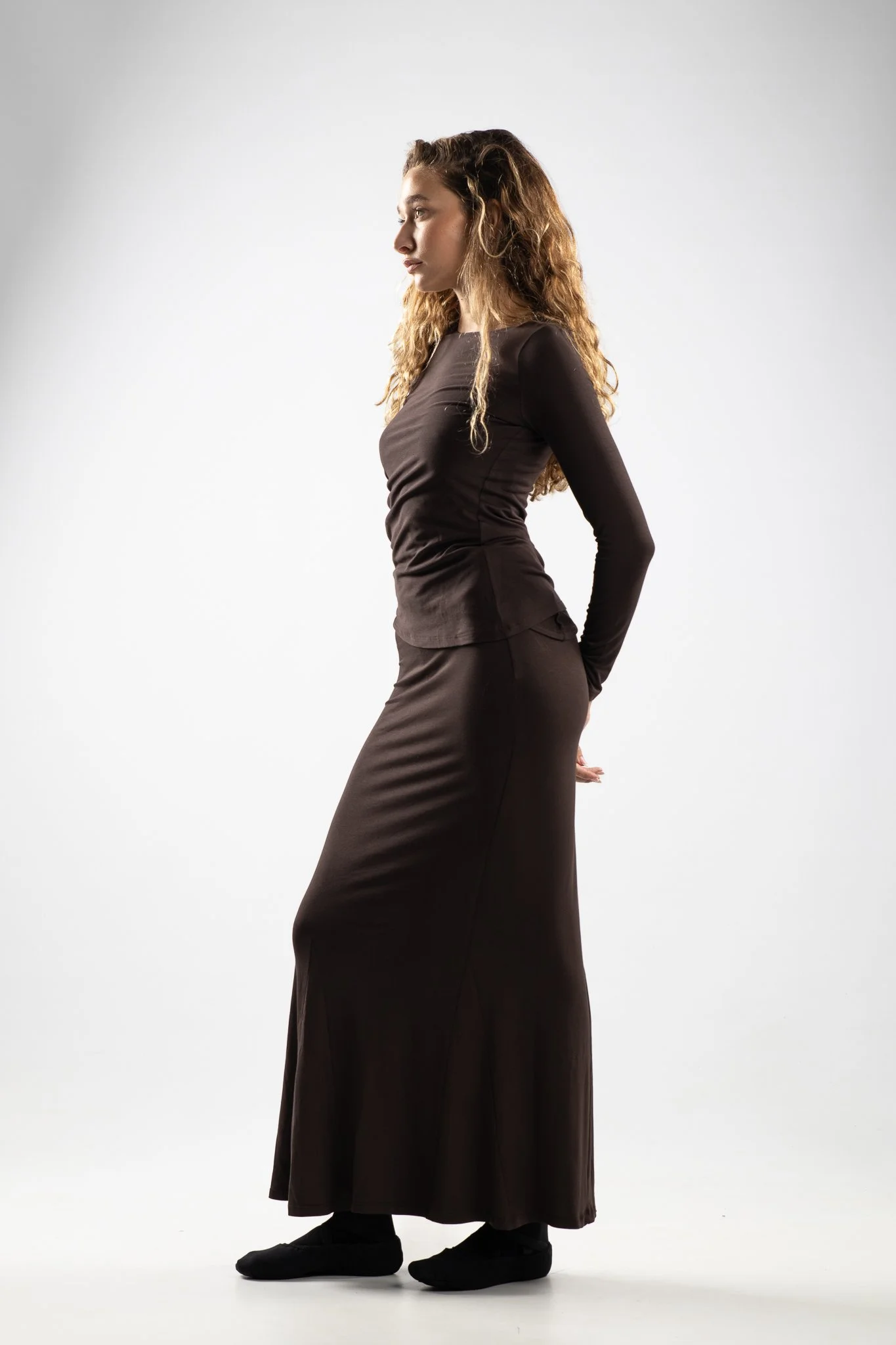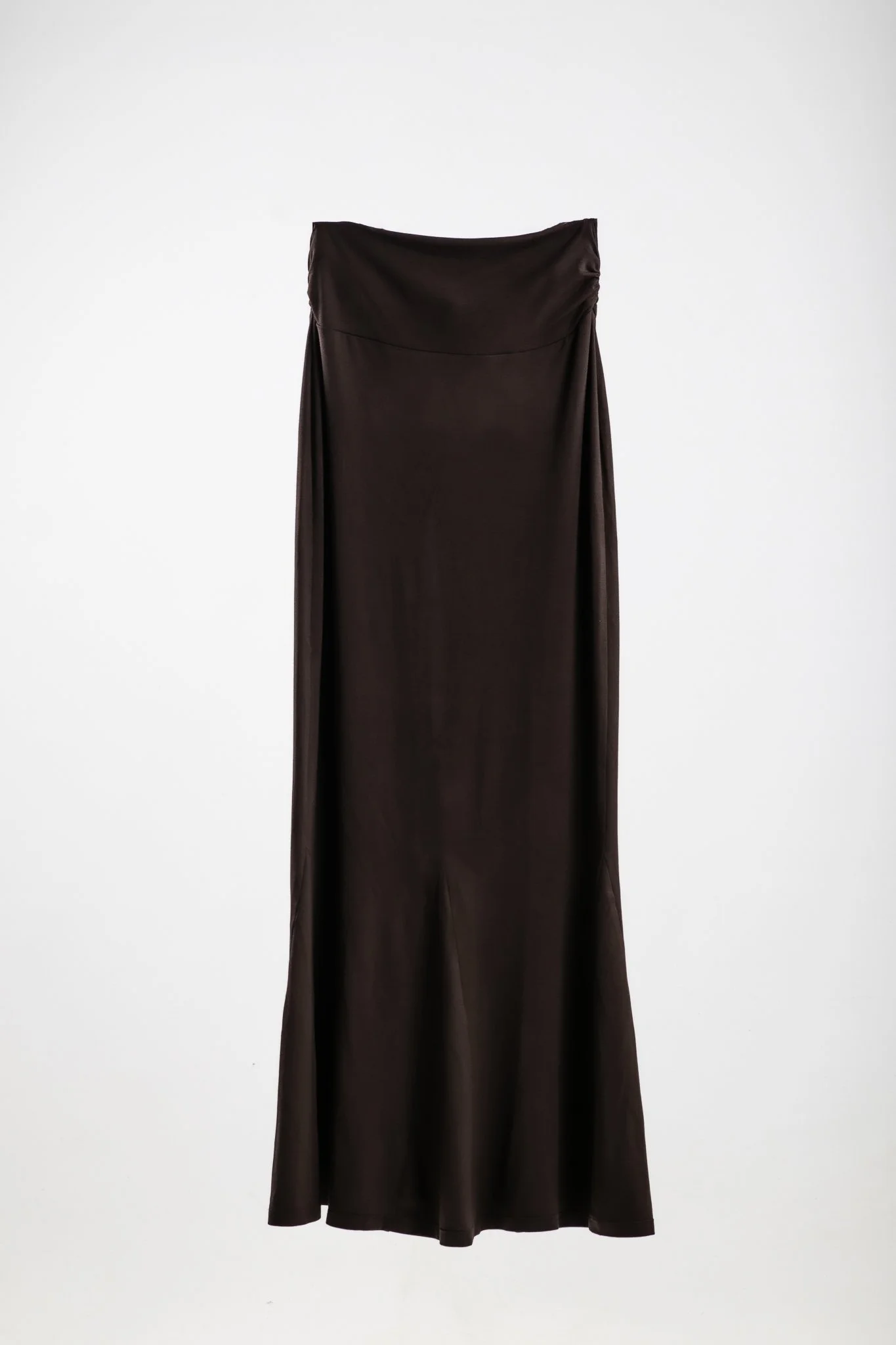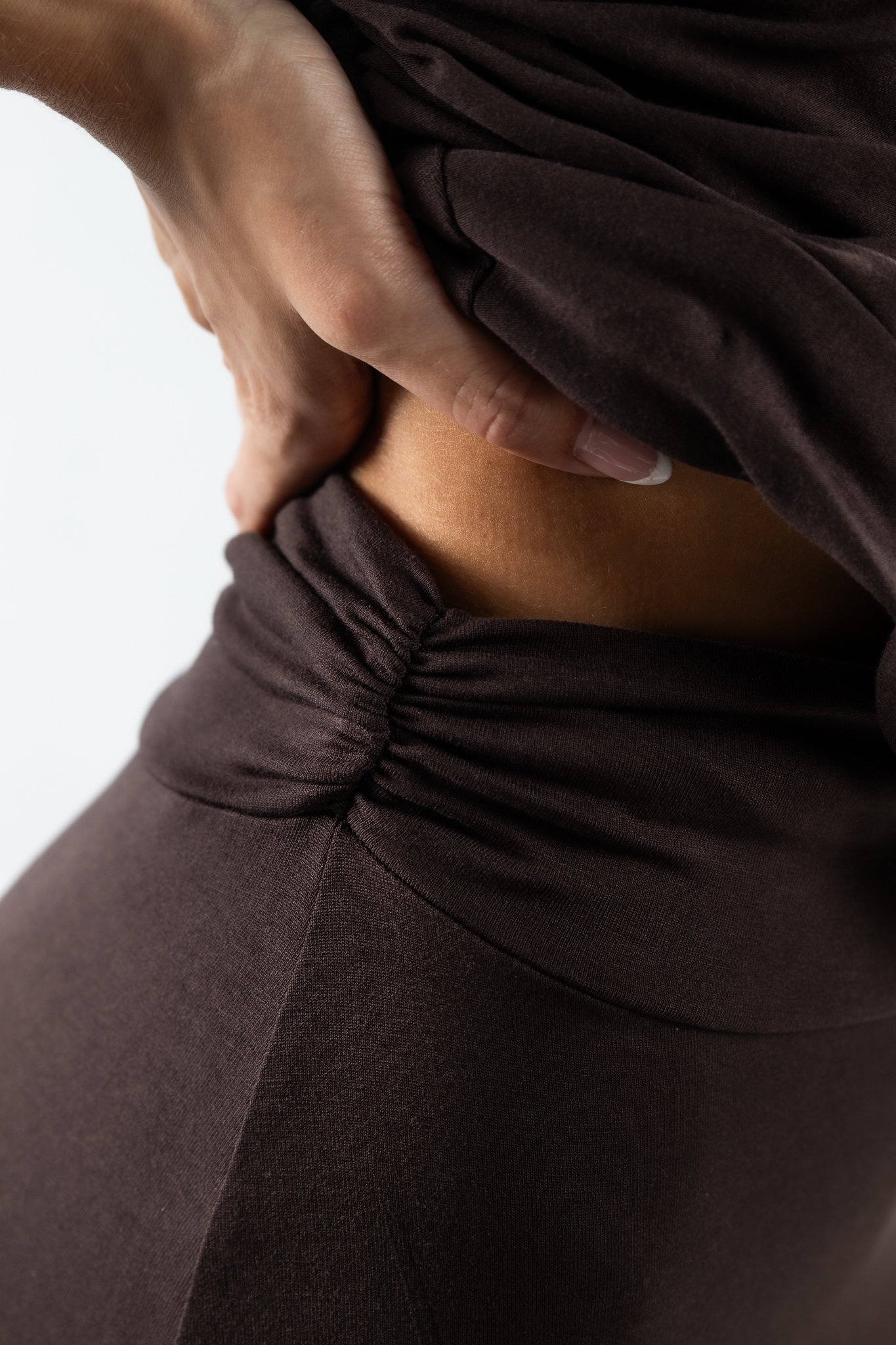Falda evasé larga con cinturilla fruncida. Sublimado con un estampado único en la falda exterior. Falda principal confeccionada en tul elástico reciclado. Forro interior de viscosa natural.